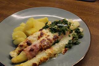 - jeweils eine Spargelstange in eine Scheibe Kochschinken einrolen